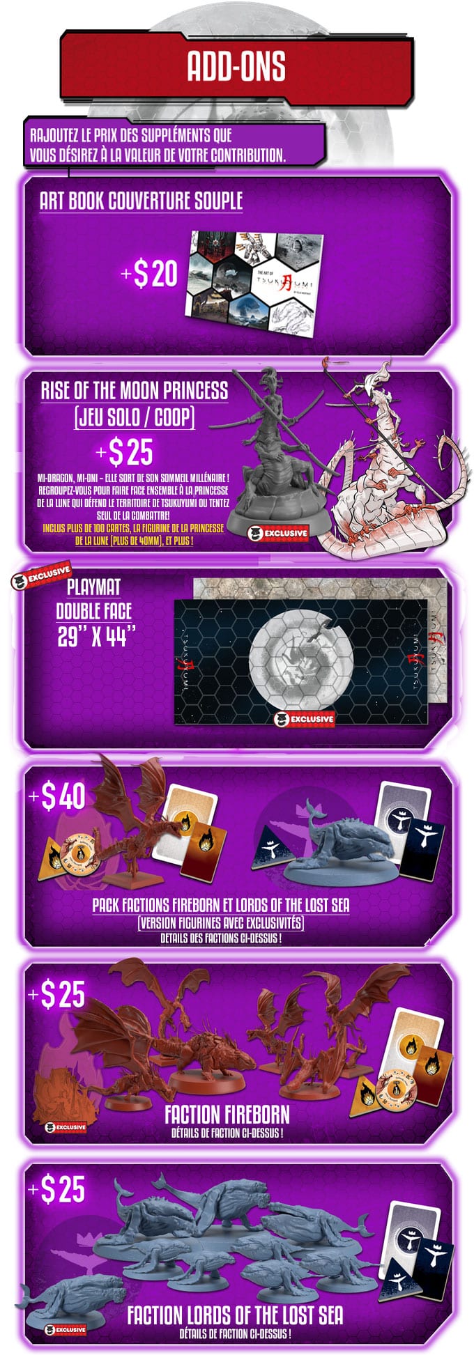 Tsukuyumi est un jeu de stratégie asymétrique avec une grande profondeur de jeu et une histoire riche et [engageante]. Il a déjà eu un lancement il y a quelques temps, applaudi par les critiques aux Etats-Unis tels que Dice Tower et la communauté de Boardgamegeek. Cette fois-ci, nous incluons en plus des figurines pour donner au jeu la production qu’il mérite. Et quelques belles surprises supplémentaires vous attendent, rejoignez-nous !
