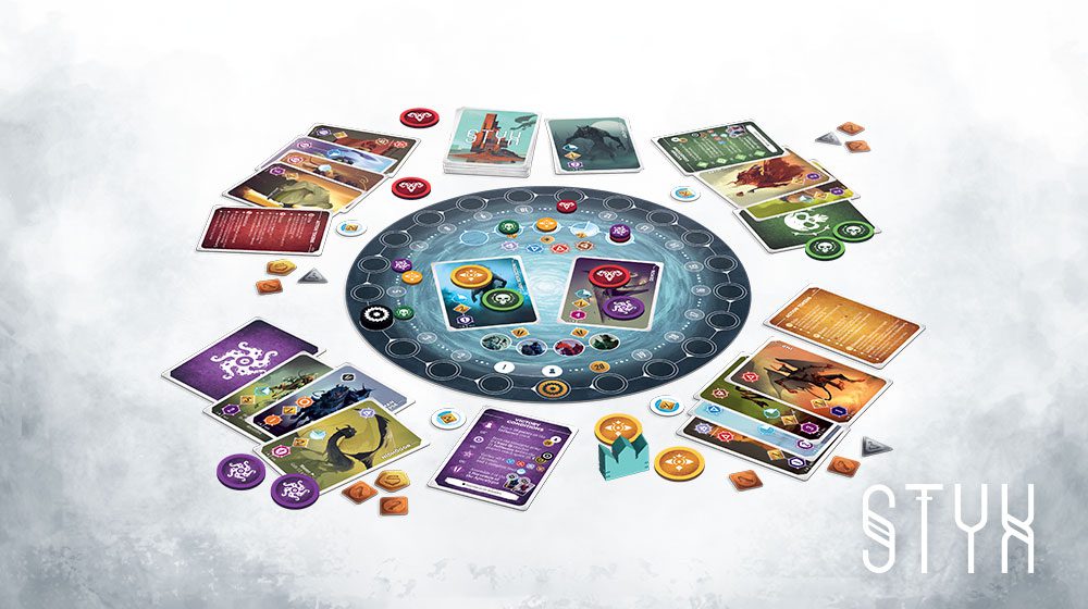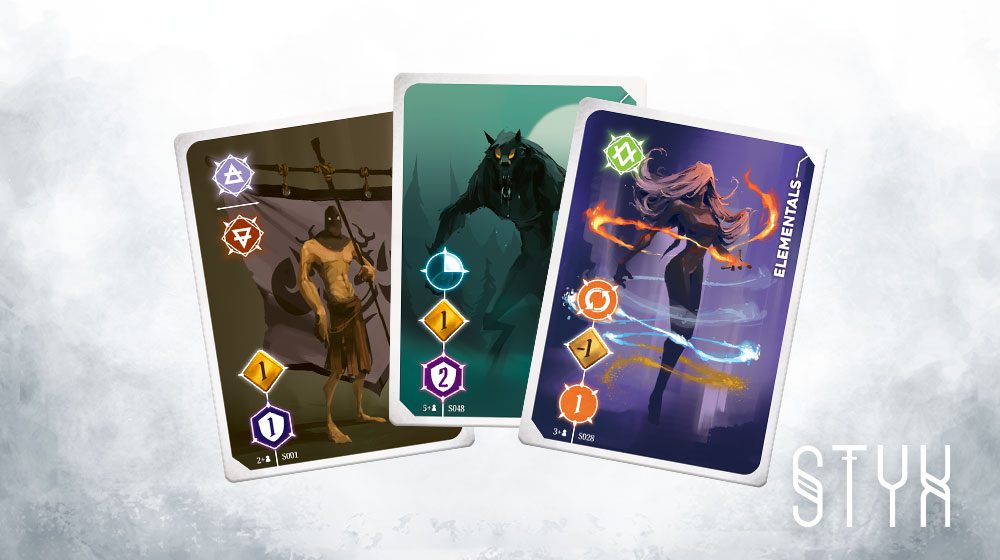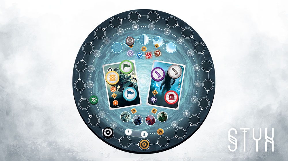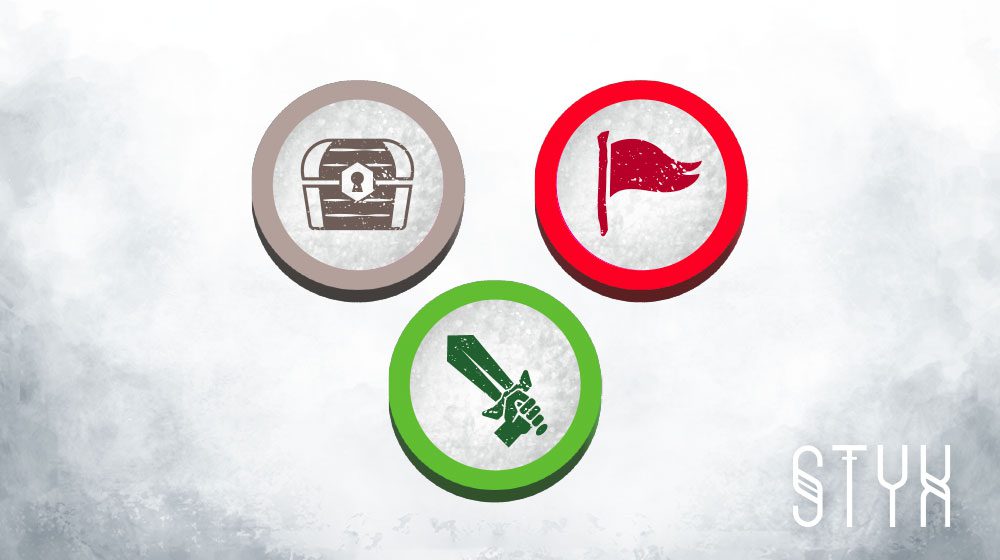 A game of STYX is divided into turns called Audiences. During each Audience, 2 Emissaries from the Tribes of the Underworld are sent forth to pledge their allegiance to the Throne. Each player secretly chooses a token determining their chosen course of action toward the Emissaries. Depending on the players’ choices, they may gain the allegiance of the tribe, influence, gold, and the Elements they need to win the race to the Throne. They may also choose to betray the Emissaries, slaying them in order to harvest their souls and slow their competition down.
