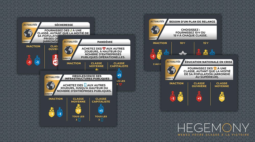 Hegemony est un jeu de société asymétrique politico-économique basé sur des cartes qui simule une le fonctionnement d’une nation entière. Prenez le contrôle d’une des trois classes socio-économiques : la classe ouvrière, la classe moyenne, la classe capitaliste… ou même de l’État !