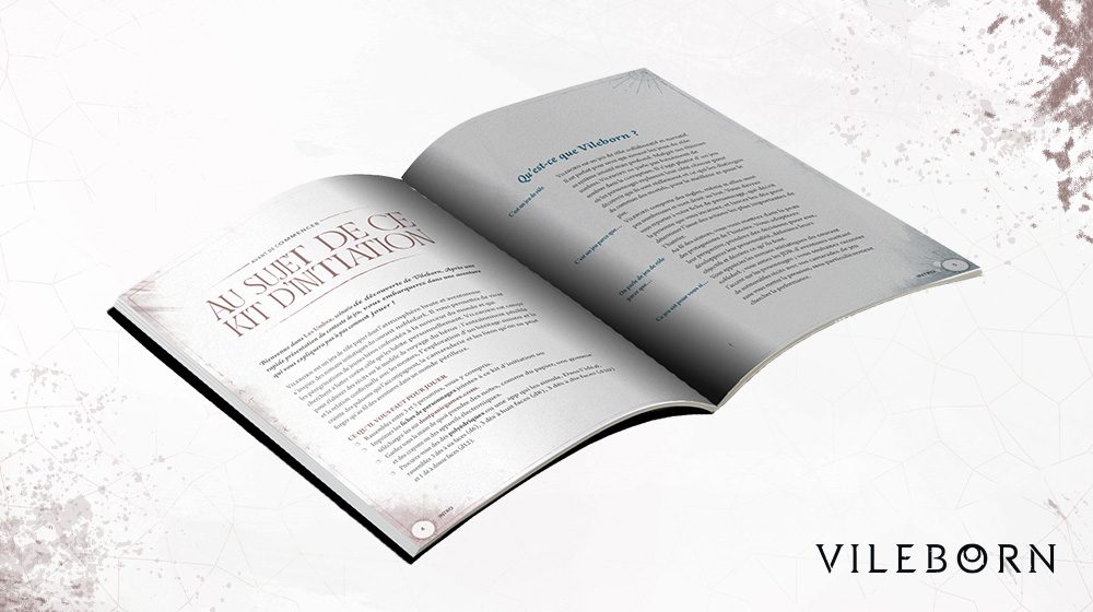 Le Kit d’initiation au jeu de rôle Vileborn consiste en réalité en un scénario de découverte jouable en deux séances qui, après une rapide présentation du contexte de jeu, vous embarquera dans une aventure qui vous expliquera pas à pas comment jouer !